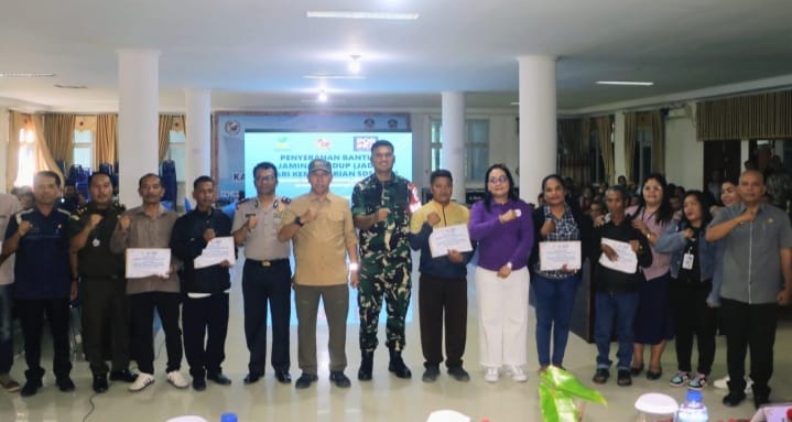 Tapanuli Utara-icwpost I Bupati Tapanuli Utara Dr. Jonius Taripar Parsaoran Hutabarat, S.Si, M.Si bersama Forkopimda didampingi Ketua TP. PKK Ny. Neny Angelina JTP Hutabarat menyerahkan secara simbolis bantuan jaminan hidup (jadul) dari Kementerian Sosial RI bagi 434 Kepala Keluarga (KK) terdampak bencana Hidrometerologi, bertempat di Aula Martua Kantor Bupati Tapanuli Utara, Tarutung Jumat, (06/3)