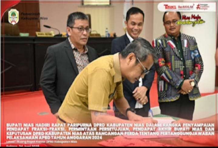 Pendapat Akhir Bupati Nias menyatakan bahwa Ranperda tentang Pertanggungjawaban Pelaksanaan APBD anggaran tahun 2024 untuk ditetapkan menjadi peraturan daerah sesuai ketentuan dan peraturan yang berlaku,”jelas Bupati Nias.